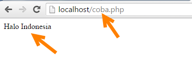 Sekarang buka aplikasi browser yang Anda miliki ( Google Chrome, Mozila, dll) lalu arahkan halaman browser Anda ke alamat localhost/coba.php Jika Anda sukses tidak terjadi error maka di halaman browser tersebut akan menampilkan pesan “Halo Indonesia”. Untuk lebih jelasnya seperti gambar berikut ini